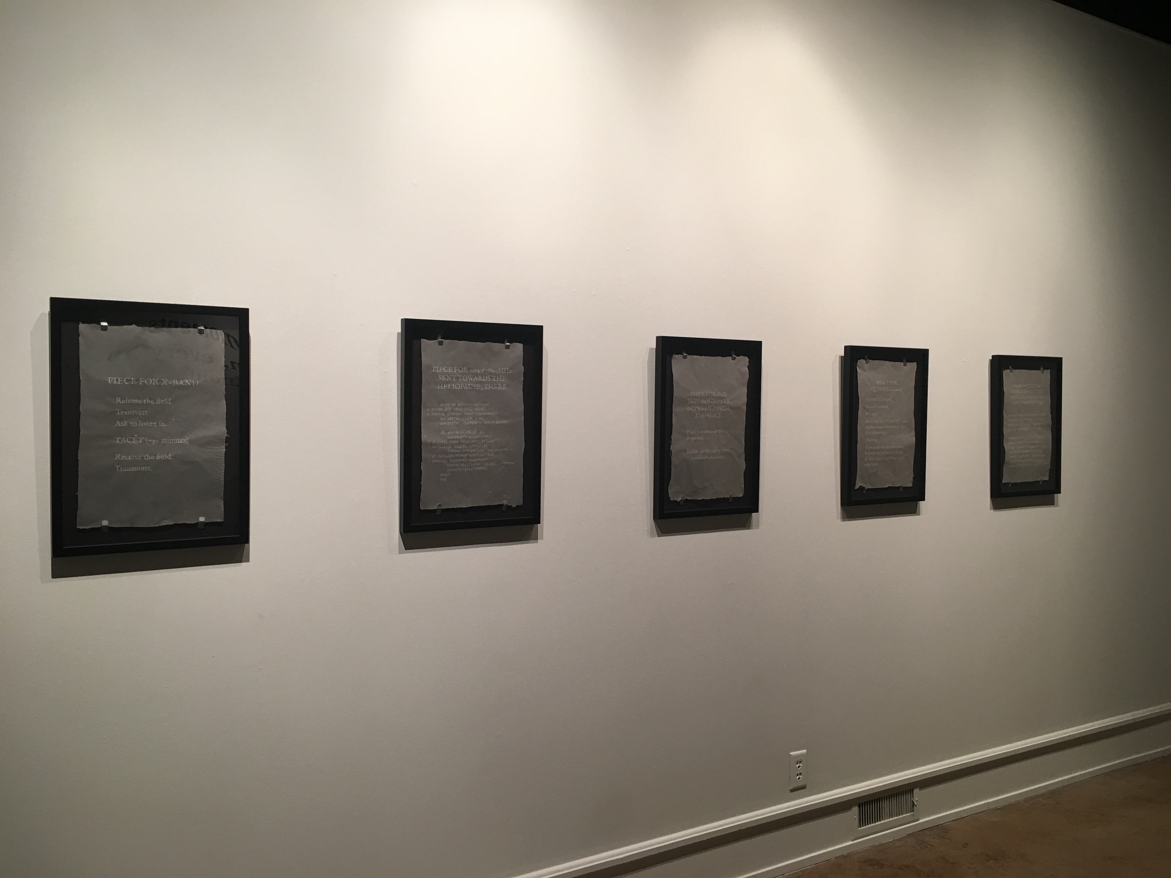 I have a solo exhibition opening today at the Clayton Staples Gallery at Wichita State University in Wichita, Kansas. Entitled "Of those moments in-between, everything", the show features all new work about satellites, signals, communication with extraterrestrial entities, and handmade paper. The two pieces are called "PIECES FOR PERFORMER (S) AND EXTRATERRESTRIAL ENTITIES" (2017-present) and "they transmitted continuously / but our times rarely aligned / and their signals dissipated in the æther" (2018). The show is open until March 1st.